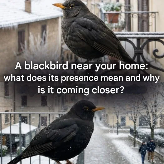 The reason is pragmatic. The blackbird is highly adaptable. When temperatures drop and food becomes scarce in natural habitats, it turns to more favorable environments. Gardens, yards, balconies, and urban parks often provide what it seeks: fallen fruits, hidden insects, decorative berries, or bird feeders set up by residents.