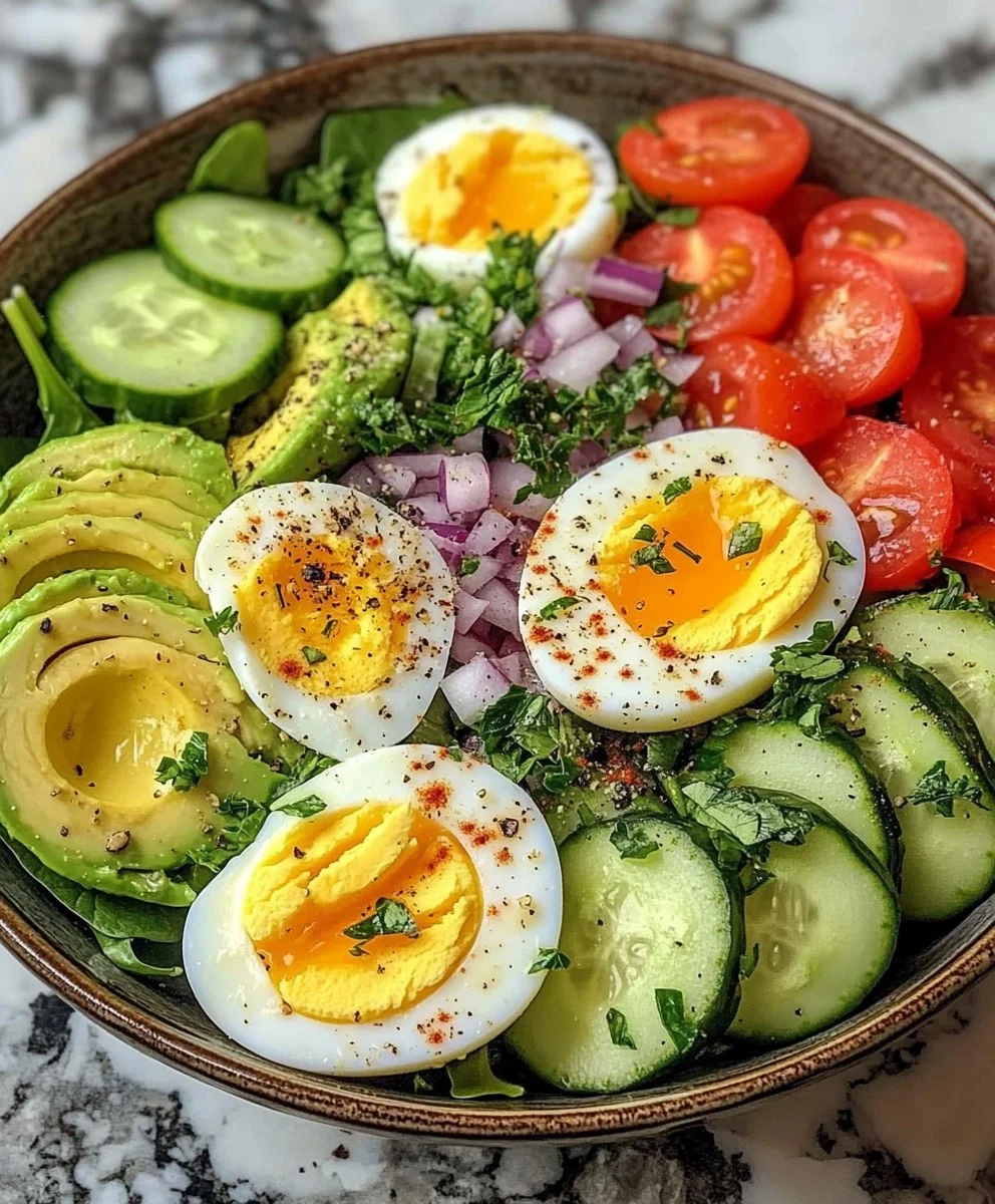 This Avocado & Egg Rainbow Salad Bowl is as beautiful as it is nourishing. Packed with colorful, fresh vegetables, creamy avocado, and protein-rich soft-boiled eggs, it’s a wholesome and satisfying meal that’s perfect for lunch or a light dinner. Enjoy it as is or drizzle with your favorite dressing.