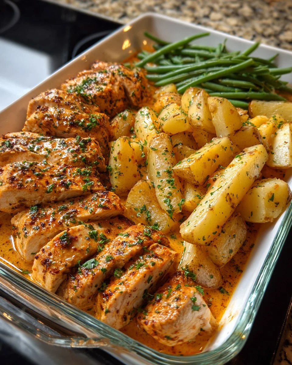This Baked Chicken with Herb Potatoes & Garlic Butter Green Beans is a wholesome and flavorful dish perfect for any night of the week. Juicy, seasoned chicken breasts are paired with crispy herb-roasted potatoes and buttery green beans to create a balanced, satisfying meal all made in one dish.
