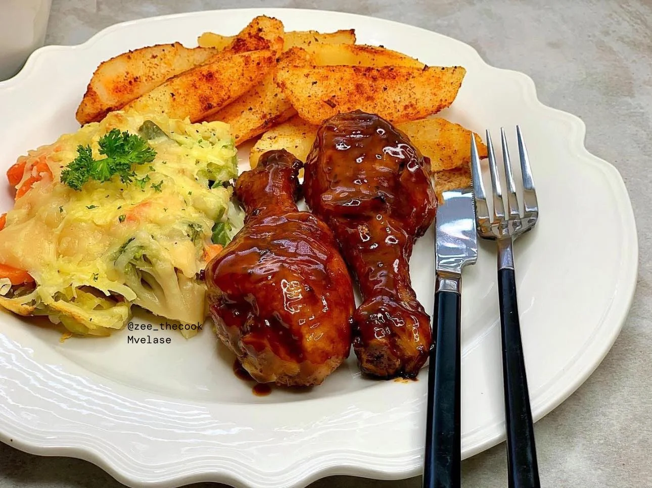 This flavorful and satisfying dinner plate features juicy BBQ-glazed chicken drumsticks, crispy seasoned potato wedges, and a cheesy vegetable bake. It’s a wholesome and colorful combination that brings comfort and nutrition together.