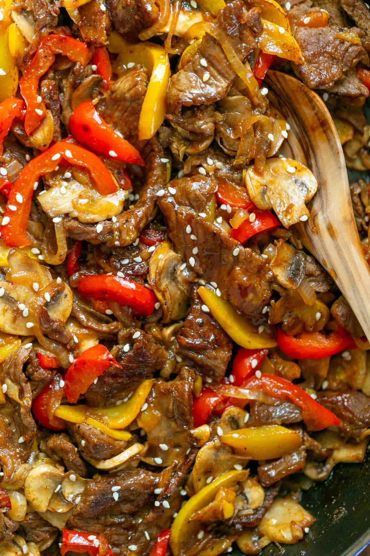 This quick and colorful beef stir fry is packed with tender beef strips, crisp bell peppers, mushrooms, and onions, all tossed in a savory garlic-ginger sauce and topped with sesame seeds. Perfect for weeknight dinners served with rice or noodles.