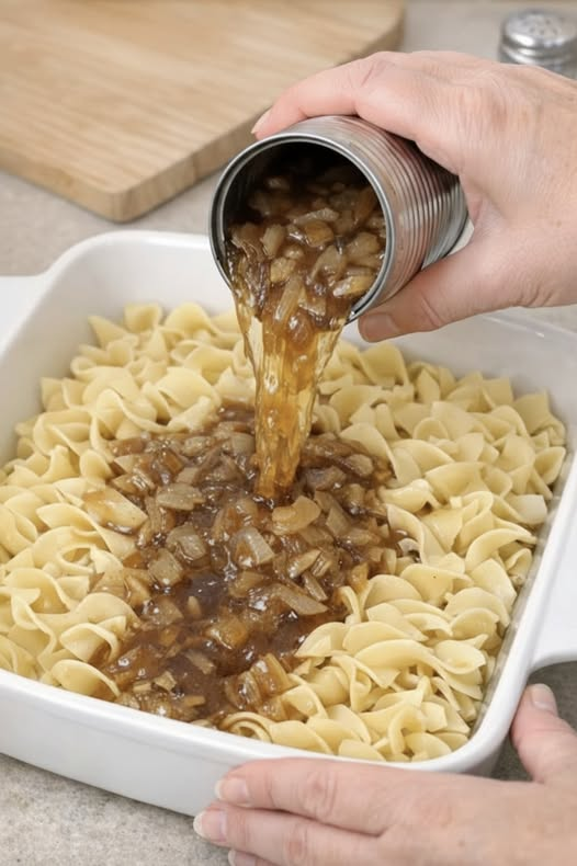 This comforting casserole combines tender egg noodles with savory beef and rich onion gravy, baked together for a hearty, satisfying meal. Simple ingredients come together to create a cozy, family-friendly dish perfect for weeknights.