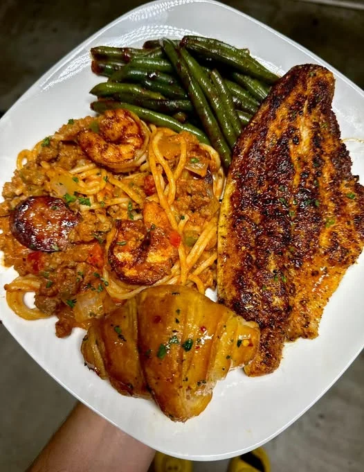 This bold and flavorful dinner plate features perfectly seasoned blackened catfish paired with rich Cajun spaghetti, sautéed shrimp, and savory sides. It’s a Southern-inspired meal packed with spice, comfort, and satisfying textures.