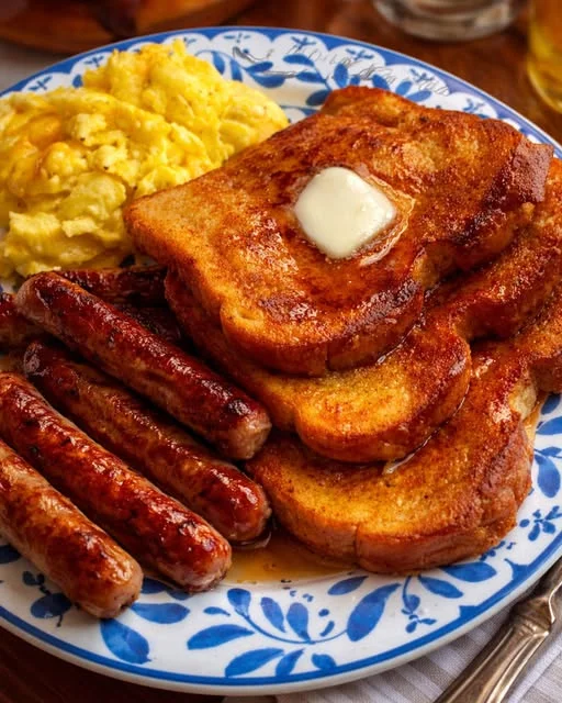 French Toast Breakfast with Sausage, Bacon, and Scrambled Eggs