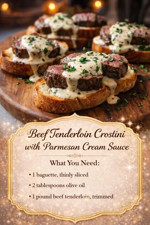 Beef Tenderloin Crostini with Parmesan Cream Sauce