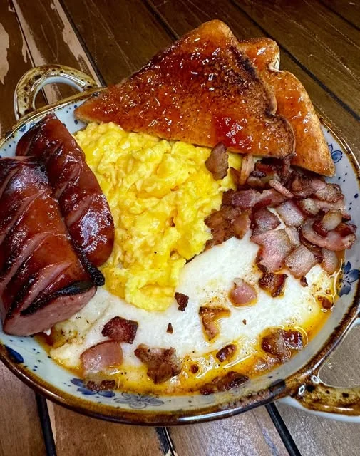 Breakfast Grits Bowl with Eggs, Sausage, Bacon and Jelly Toast