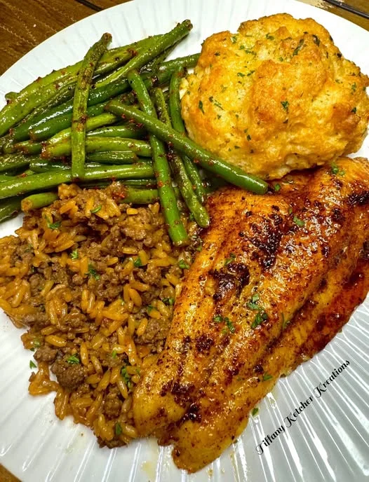 This Catfish Dinner with Dirty Rice is a comforting Southern‑style meal packed with bold flavors and hearty sides. Crispy seasoned catfish fillets are served with savory dirty rice, tender sautéed green beans, and a fluffy biscuit for a satisfying dinner plate that feels homemade and full of warmth.