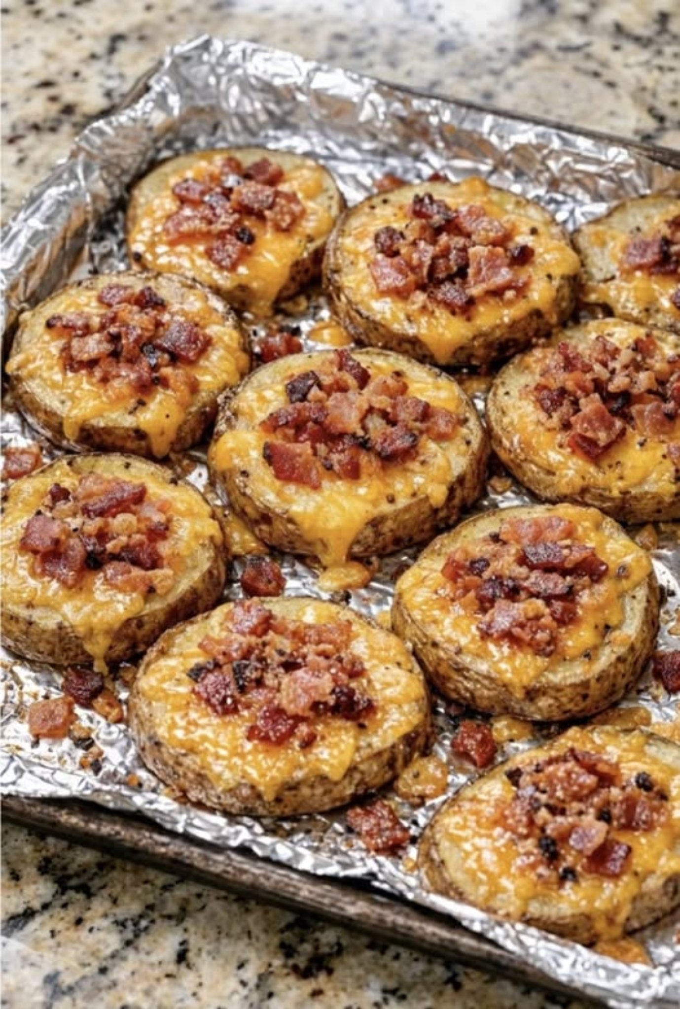 These crispy roasted potato slices are topped with melted cheese and savory bacon, making them an irresistible appetizer or side dish. Perfectly seasoned and baked until golden, they’re simple yet packed with flavor.