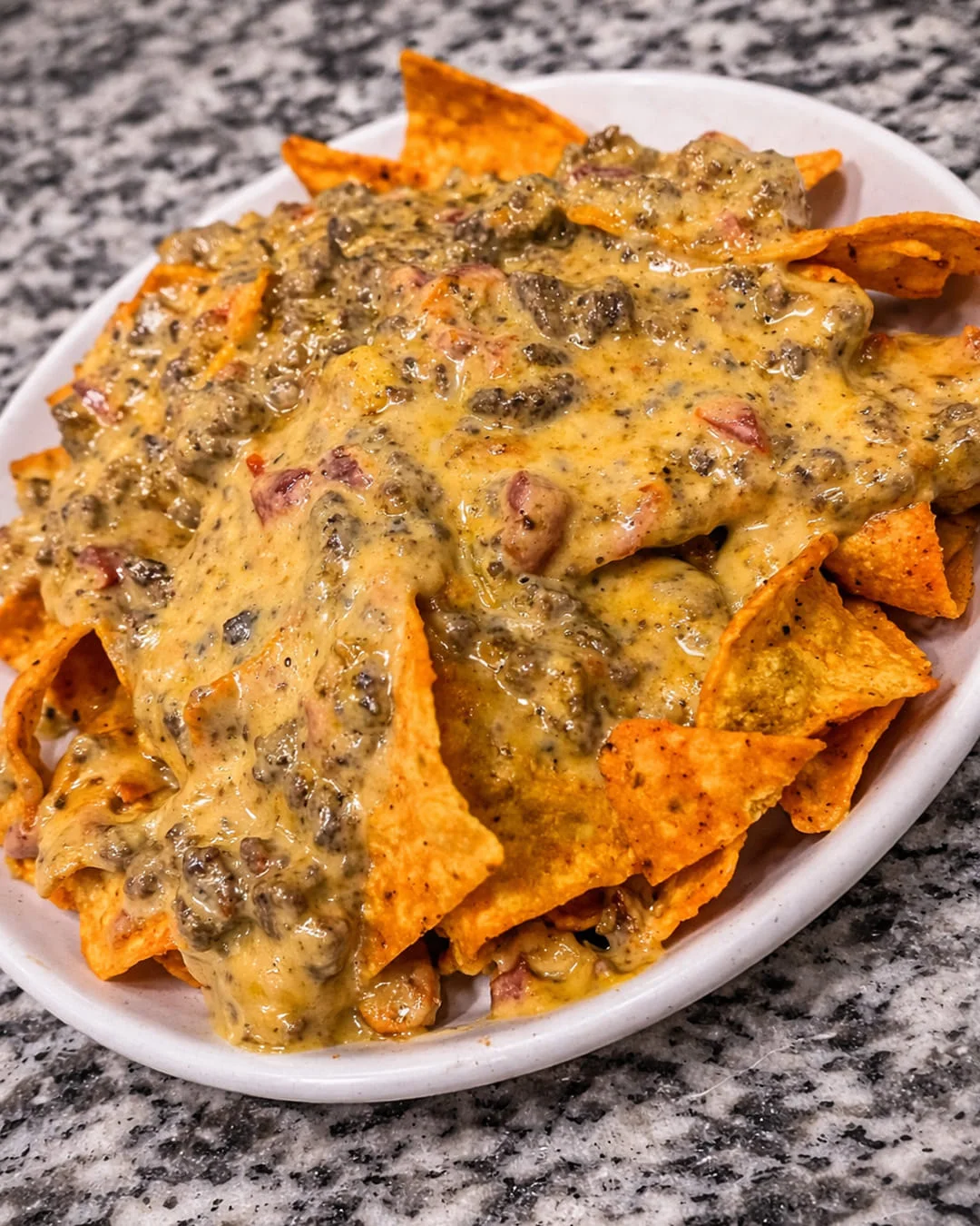 These cheesy loaded nachos are piled high with crispy tortilla chips, savory seasoned beef, smoky bacon, and a rich, melty cheese sauce. Perfect for game day, parties, or a fun snack, this dish is packed with bold flavors and irresistible texture.