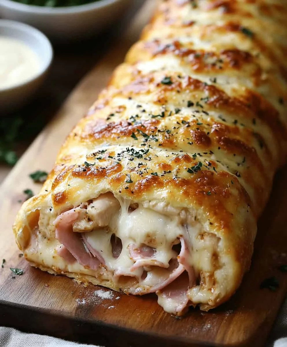 This Chicken Cordon Bleu Stromboli is a mouthwatering twist on the classic dish, wrapped in golden, cheesy pizza dough. Filled with layers of tender chicken, smoky ham, and melty Swiss cheese, it’s a crowd-pleaser perfect for game day, dinner parties, or a fun family meal.