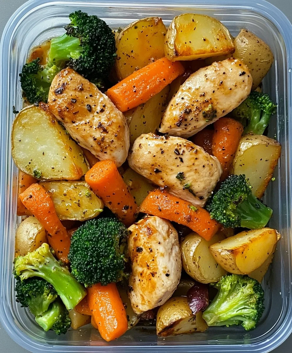 This Chicken Veggie Power Box with Garlic Potatoes & Carrots is a well-balanced meal prep option that’s hearty, colorful, and easy to make. With tender roasted chicken, seasoned vegetables, and crispy golden potatoes, it provides a filling and flavorful solution for your lunch or dinner needs.