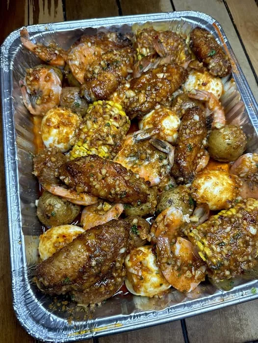 This chicken wing and shrimp boil is a bold, buttery, and flavor-packed dish loaded with juicy shrimp, crispy chicken wings, tender potatoes, sweet corn, and eggs, all tossed in a rich garlic seasoning sauce. Perfect for sharing and guaranteed to impress.