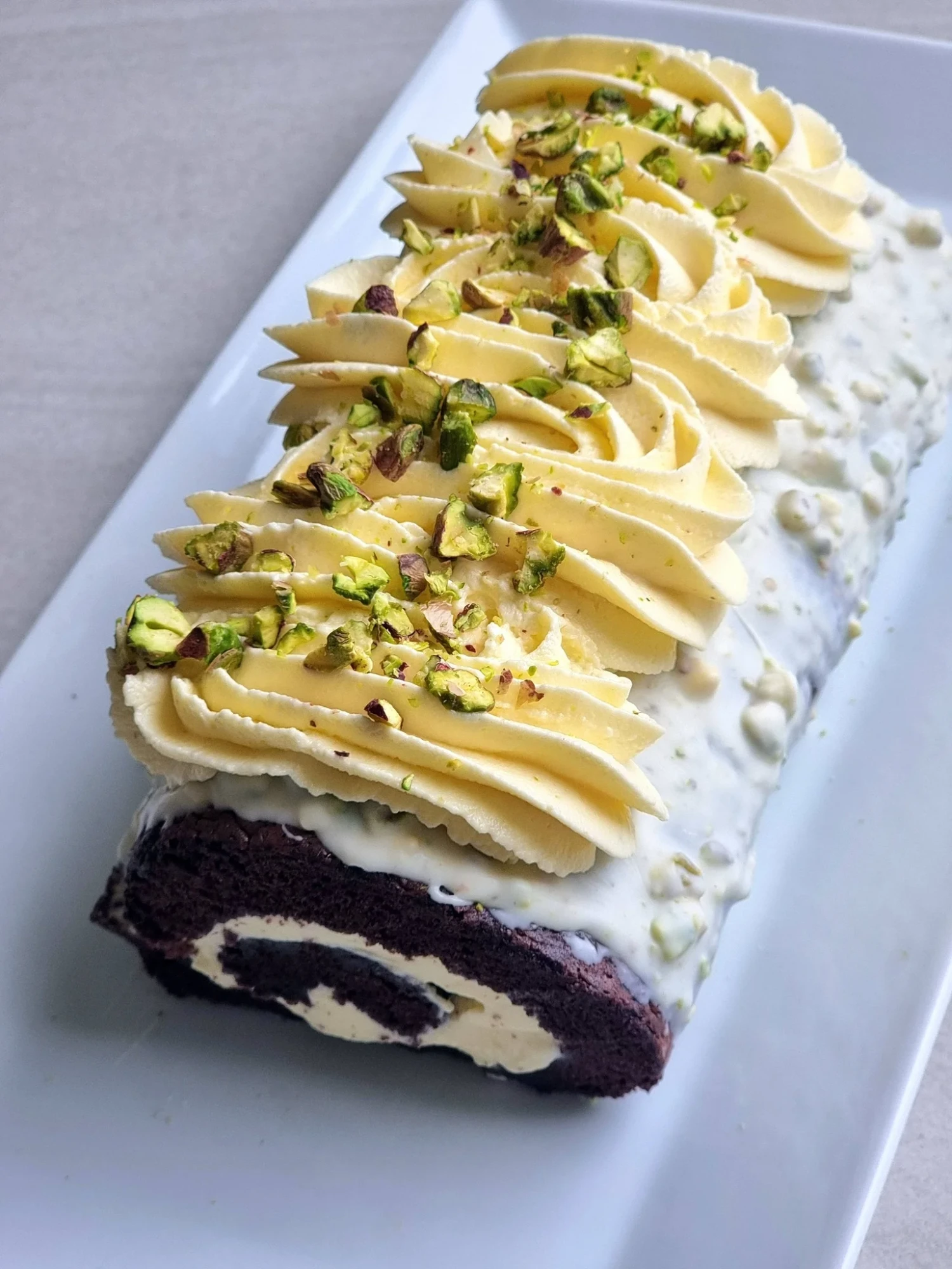 Chocolate Swiss roll with white chocolate mousse is an elegant dessert featuring a soft, airy chocolate sponge rolled around a silky white chocolate mousse filling. Finished with creamy frosting and sprinkled with chopped pistachios, this beautiful cake is perfect for celebrations, holidays, or whenever you want a rich and impressive dessert.