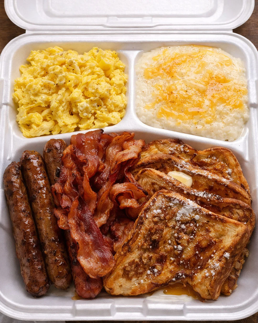 Start your day with the ultimate comfort food — the Classic Breakfast Platter. This hearty breakfast includes fluffy scrambled eggs, creamy cheese grits, crispy bacon, savory breakfast sausage links, and golden-brown French toast drizzled with syrup and a pat of butter. It’s a soul-warming way to fuel your morning.