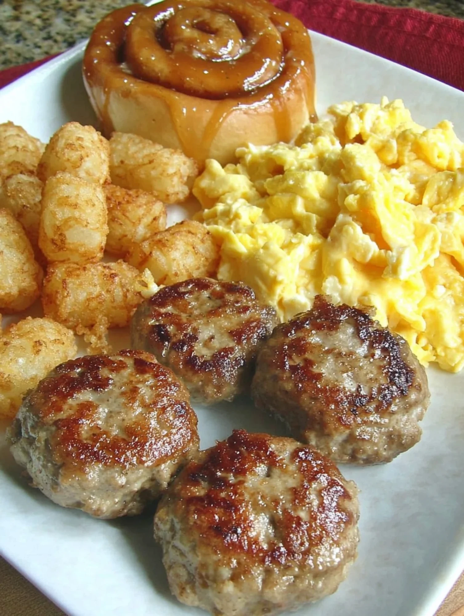This Classic Country Breakfast Plate is the ultimate hearty morning meal, featuring juicy breakfast sausage patties, fluffy scrambled eggs, crispy golden tater tots, and a sweet, gooey cinnamon roll. It’s a balance of savory and sweet that hits all the right notes to start your day strong.