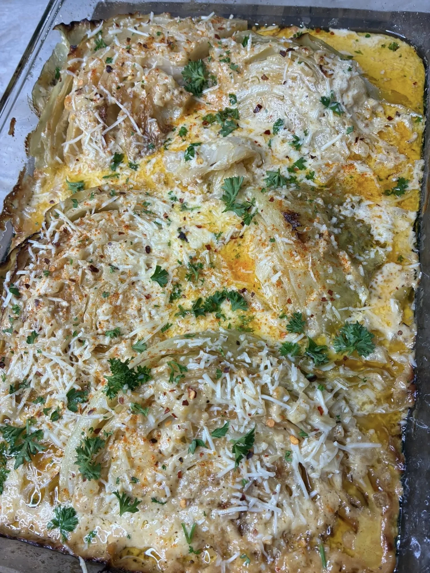 These creamy baked cabbage steaks are tender, rich, and packed with flavor. Roasted in a garlicky cream sauce and topped with melted cheese and herbs, they make a satisfying vegetarian main or hearty side dish.