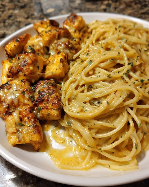 This comforting and indulgent dish combines tender, seasoned chicken with a rich, creamy cheddar sauce and perfectly cooked spaghetti. Finished with a fragrant garlic butter touch, it’s a satisfying meal that’s perfect for weeknights or special dinners.