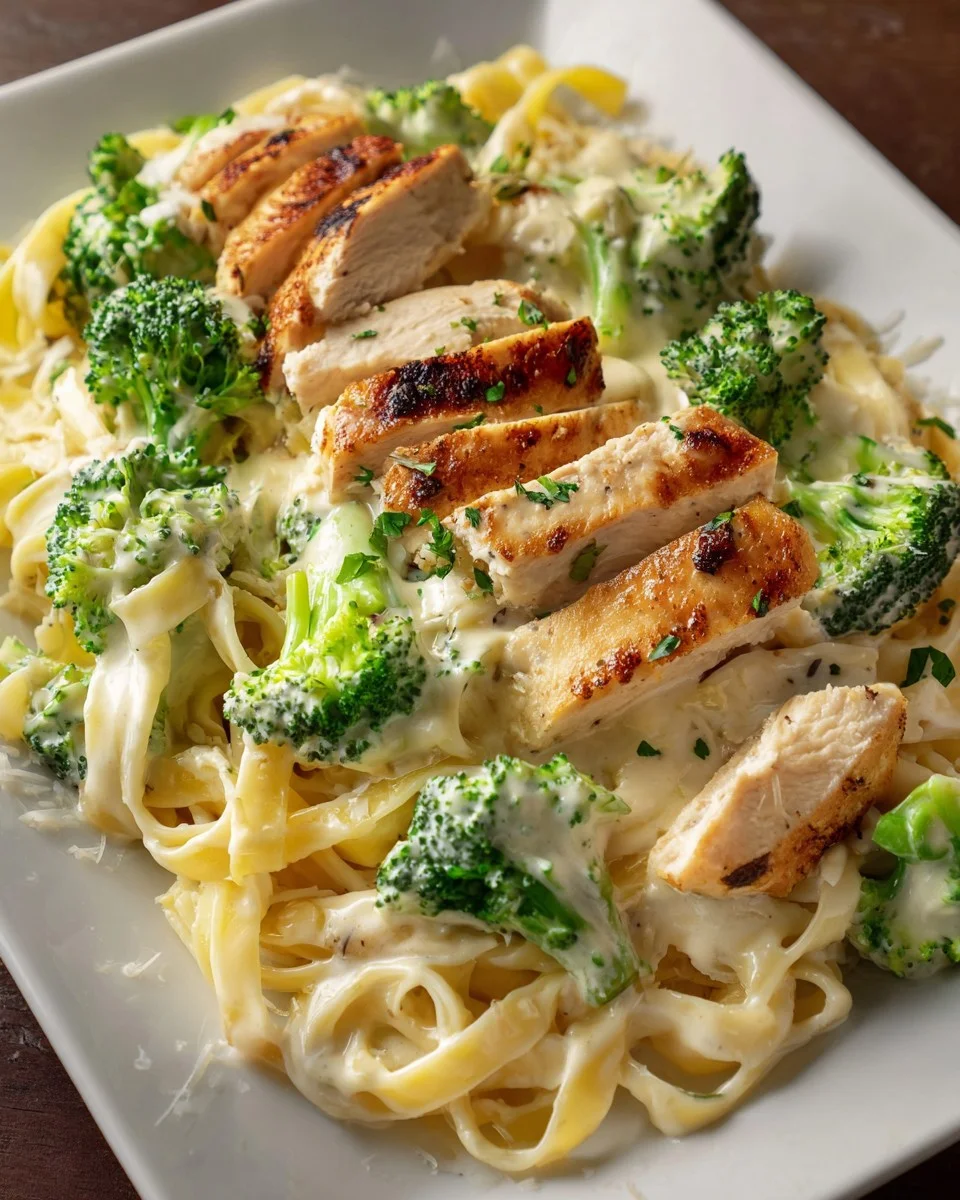 Creamy Chicken Alfredo Fettuccine with Broccoli is a delicious and satisfying pasta dish that combines tender grilled chicken, crisp-tender broccoli, and rich Alfredo sauce over fettuccine noodles. It’s a comforting and family-friendly meal perfect for any night of the week.