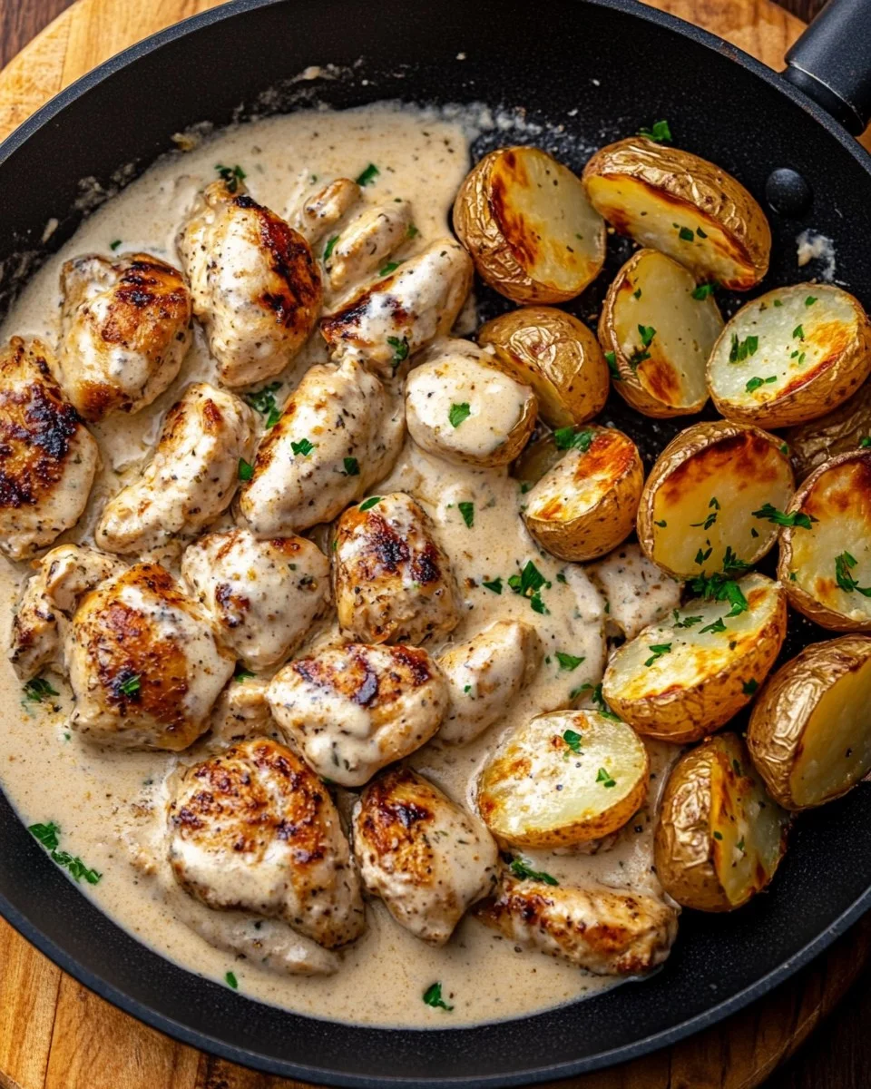 This Creamy Garlic Chicken Skillet with Roasted Baby Potatoes is the ultimate comfort food. Juicy, golden-seared chicken bites simmered in a rich garlic cream sauce are perfectly complemented by crispy, oven-roasted baby potatoes. It’s a cozy, satisfying meal all made in one skillet!