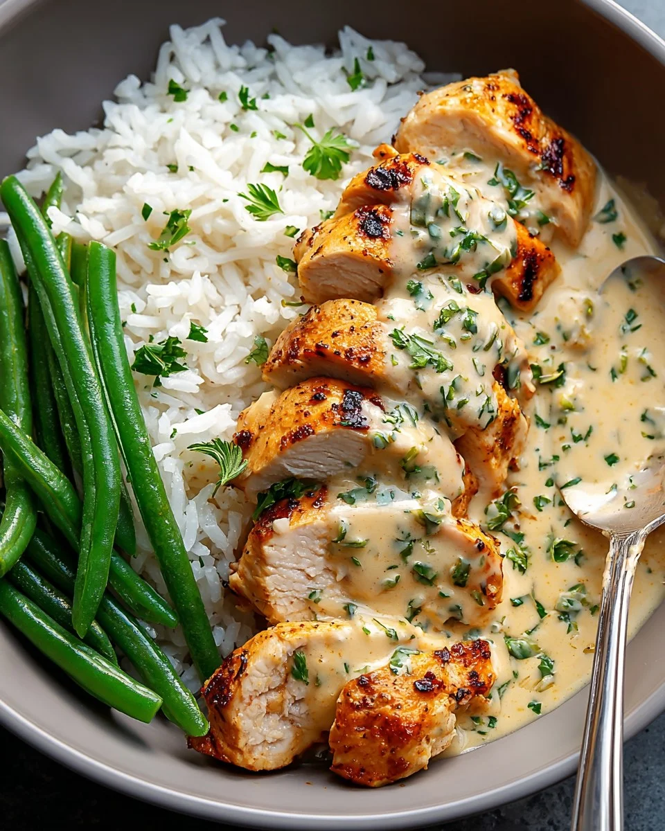 Creamy Garlic Herb Chicken with Rice & Green Beans is a flavorful and comforting dish that combines tender grilled chicken with a rich, herb-infused cream sauce. Served with fluffy white rice and crisp green beans, this meal is as wholesome as it is satisfying.