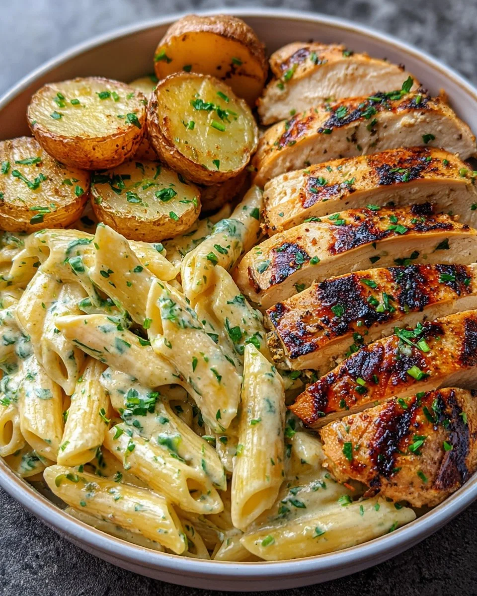 This Creamy Garlic Herb Pasta Bowl is a savory and satisfying dish that brings together perfectly grilled chicken, velvety garlic herb pasta, and crispy roasted potatoes. It’s packed with flavor, making it a comforting and balanced meal ideal for lunch or dinner.