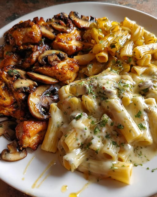 This creamy garlic mushroom chicken with white cheddar parmesan penne is a rich and satisfying dish packed with bold flavors. Juicy, seasoned chicken and sautéed mushrooms are paired with tender pasta in a velvety, cheesy garlic sauce for the ultimate comfort meal.