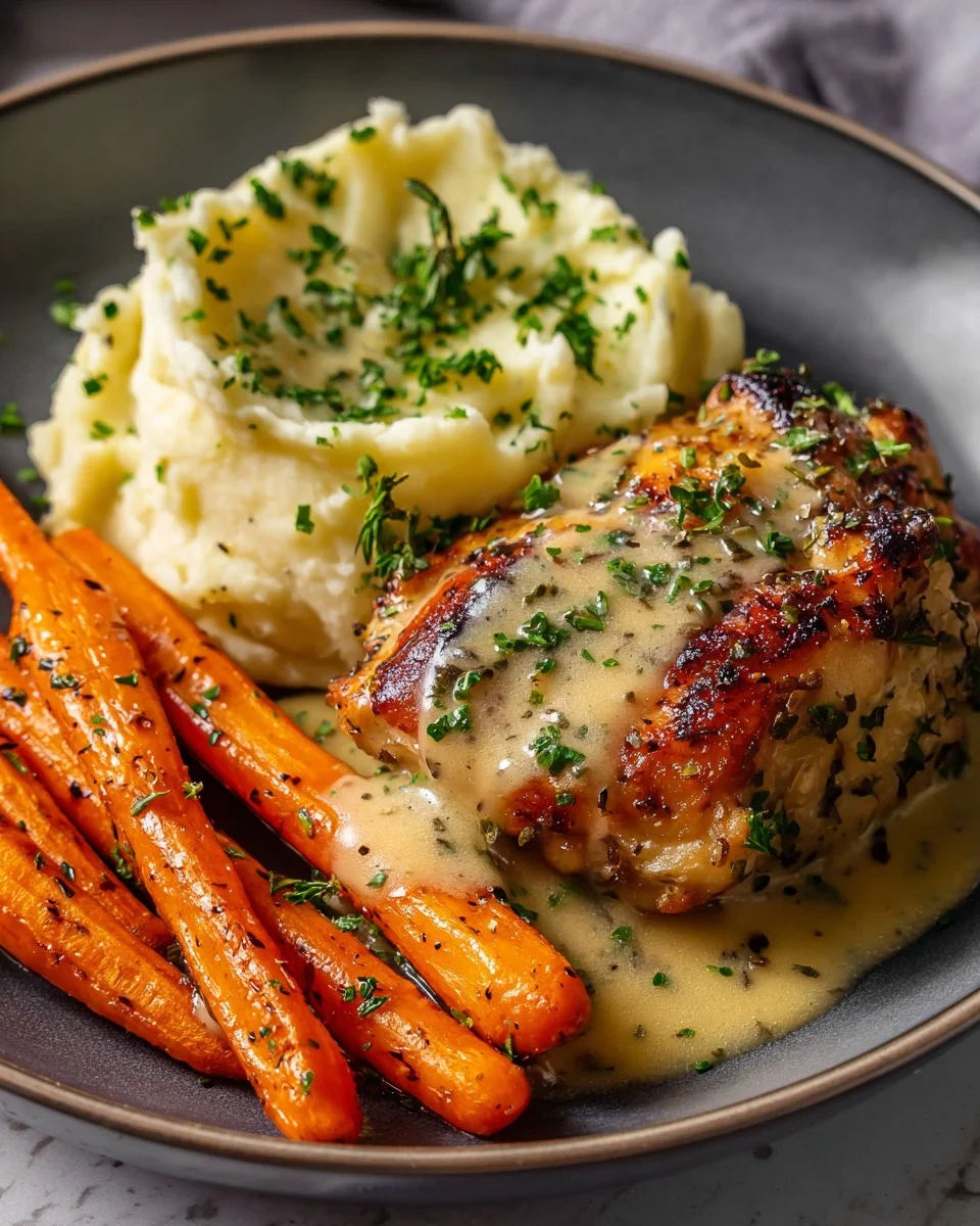 This comforting plate of Creamy Herb Chicken Thighs with Roasted Carrots & Mashed Potatoes brings homestyle cooking to a new level. Juicy, seared chicken thighs are bathed in a rich, herby cream sauce, paired with sweet oven-roasted carrots and buttery mashed potatoes for the ultimate cozy dinner.