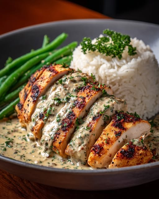 This Creamy Herb Chicken with Buttery Rice & Green Beans is an elegant yet easy dinner that’s perfect for any night of the week. Tender chicken breasts are seared to perfection and smothered in a velvety garlic-herb cream sauce, served alongside fluffy rice and crisp-tender green beans for a wholesome and satisfying meal.