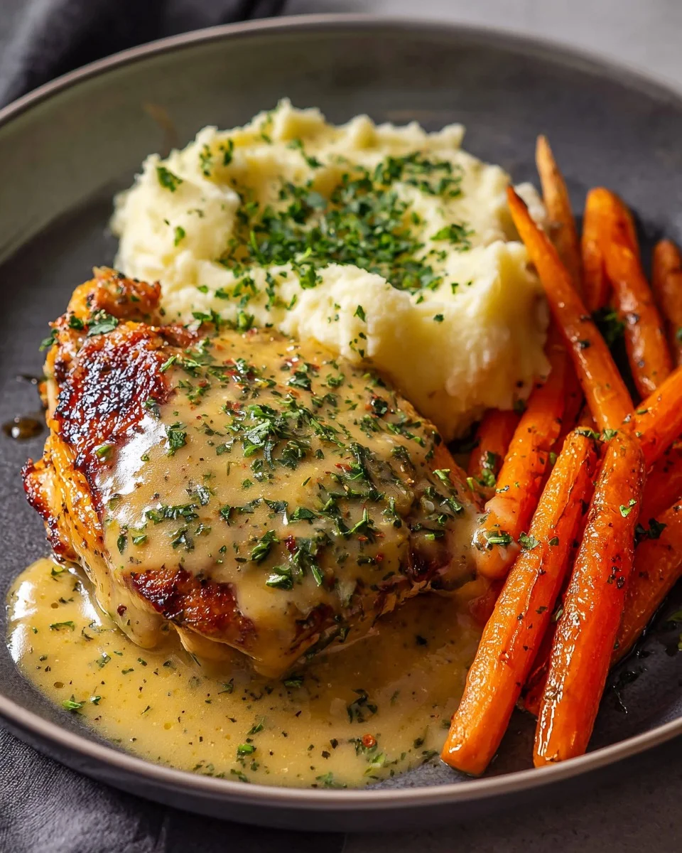 This comforting and elegant Creamy Herb Chicken plate pairs juicy, pan-seared chicken with velvety mashed potatoes and sweet roasted carrots, all topped with a luscious herb cream sauce. It’s the perfect dinner for cozy nights or when you’re craving something hearty yet refined.