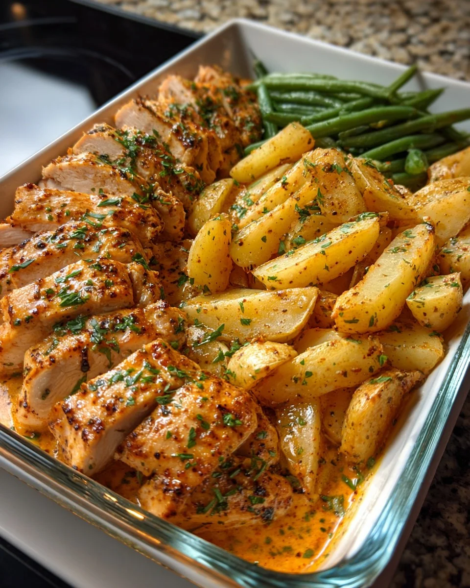 Creamy Herb Chicken with Roasted Garlic Potatoes and Steamed Green Beans is a hearty, comforting meal full of savory flavor and nourishing ingredients. Tender, juicy chicken is coated in a creamy herb sauce, paired perfectly with crispy roasted potatoes and fresh green beans.