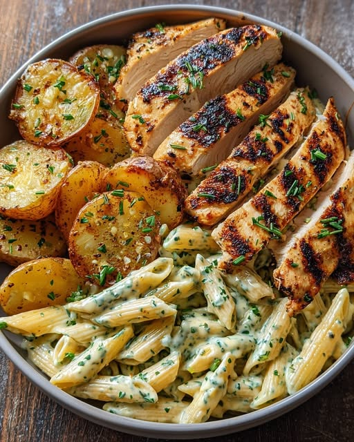 Creamy Herb Pasta with Juicy Grilled Chicken & Crispy Golden Potatoes