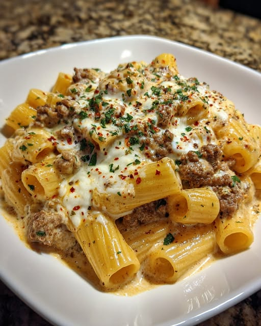 This indulgent pasta dish features tender rigatoni tossed with savory Italian-seasoned beef and coated in a rich, creamy Alfredo sauce. Finished with melted cheese and herbs, it’s a comforting meal perfect for any pasta lover.