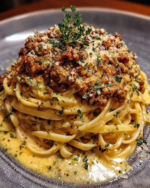 Creamy Parmesan Beef Linguine with Garlic Butter Sauce is a rich and savory pasta dish that’s packed with flavor. Ground beef, fragrant garlic, and herbs are blended into a luscious parmesan cream sauce and tossed with perfectly cooked linguine—comfort food at its finest.