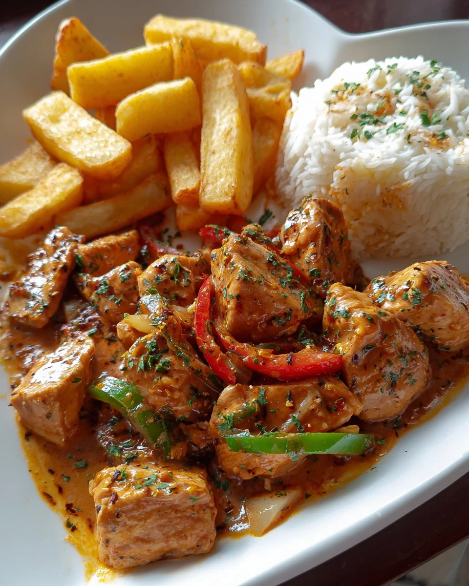 Creamy Pepper Chicken Bites with Herbed Rice & Golden Fries is a rich, satisfying dish that brings comfort and bold flavor to your plate. Juicy chicken cubes are smothered in a creamy, peppery sauce with sweet bell peppers and onions, served alongside fragrant herbed rice and crispy golden fries for the ultimate combo meal.