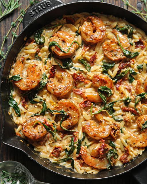 Indulge in this luscious Creamy Tuscan Shrimp Orzo Skillet—a one-pan wonder packed with juicy shrimp, sun-dried tomatoes, spinach, and a dreamy parmesan cream sauce. Perfect for a cozy dinner that feels restaurant-worthy but comes together easily at home!