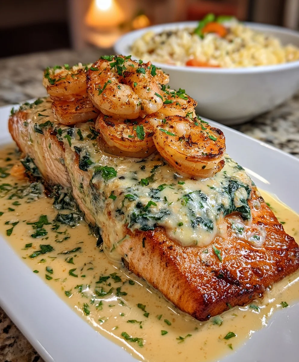 Creamy Tuscan Shrimp Salmon is a restaurant-worthy dish that’s rich, indulgent, and full of flavor. Perfectly seared salmon fillets are smothered in a luscious garlic cream sauce with spinach, sun-dried tomatoes, and tender shrimp — ideal for a special dinner or date night at home.