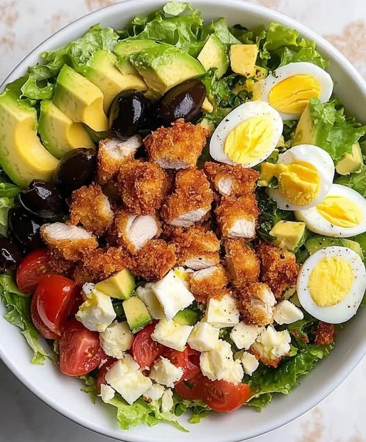 This colorful and hearty Crispy Chicken Chopped Power Salad is the ultimate meal in a bowl. Packed with protein, healthy fats, and fresh vegetables, it’s both satisfying and nourishing. Perfect for a wholesome lunch or a light dinner, this salad combines crispy chicken bites with creamy avocado, tangy feta, and classic favorites like hard-boiled eggs and cherry tomatoes.
