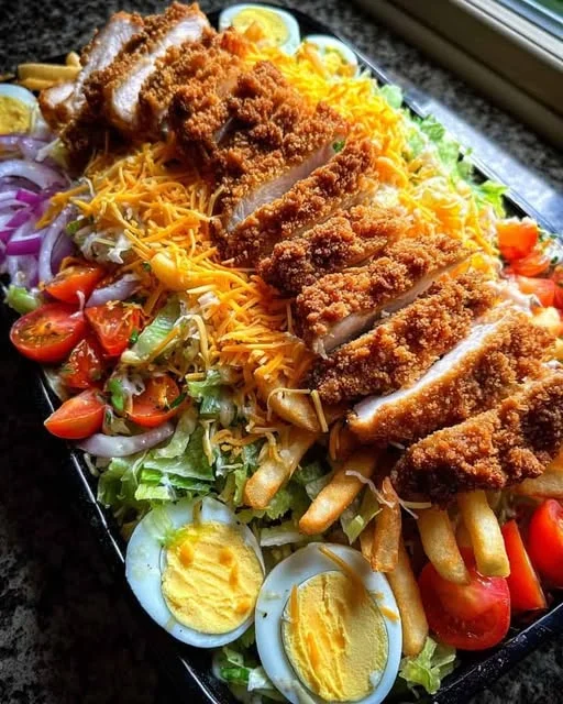 A bold and satisfying bowl loaded with crispy breaded chicken, golden fries, fresh vegetables, shredded cheese, and creamy toppings. This hearty salad bowl combines crunchy, savory, and fresh flavors, making it perfect for lunch or dinner when you want something both indulgent and refreshing.