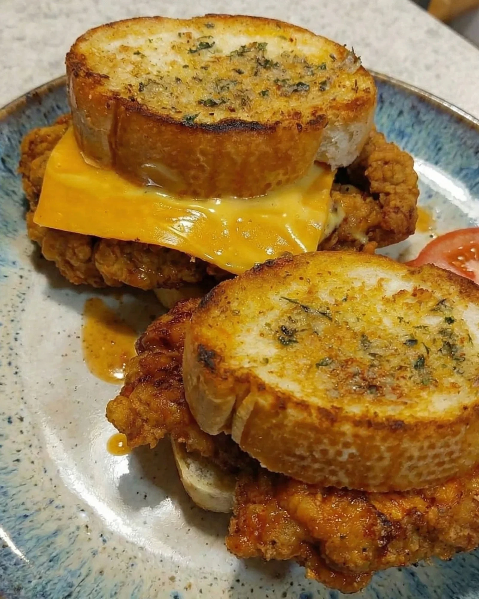 Crispy Fried Chicken and Melted Cheese on Toasted Garlic Bread is the ultimate comfort sandwich, combining juicy, crunchy fried chicken with gooey melted cheese, all layered between golden, buttery garlic bread. Perfect for lunch, dinner, or an indulgent weekend treat, this sandwich delivers bold flavor and satisfying texture in every bite.