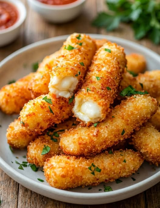 These crispy mozzarella sticks are golden on the outside and perfectly gooey on the inside. Coated in seasoned breadcrumbs and fried to perfection, they make an irresistible appetizer or snack, especially when served with marinara sauce.