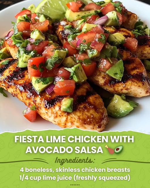 Fiesta Lime Chicken with Avocado Salsa is a fresh and vibrant dish bursting with bold flavors and nutritious ingredients. Grilled lime-marinated chicken is topped with a colorful avocado salsa made with ripe tomatoes, onions, and cilantro—a perfect balance of zest and freshness for a healthy, protein-packed meal.