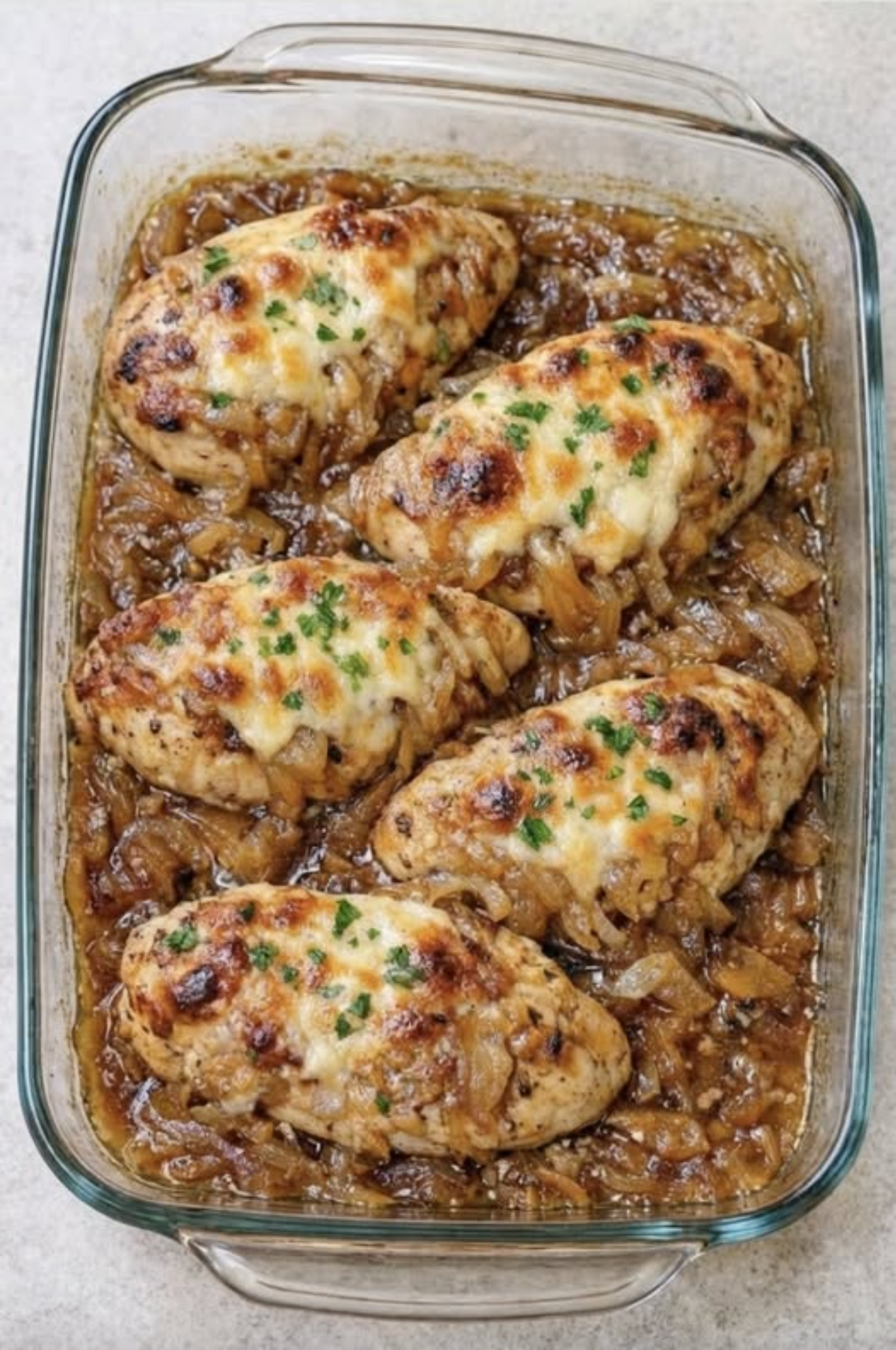 This French onion chicken bake is a savory, comforting dish featuring juicy chicken breasts smothered in rich caramelized onions and topped with melted cheese. Inspired by classic French onion soup, this recipe brings deep, slow-cooked flavor into an easy oven-baked meal.