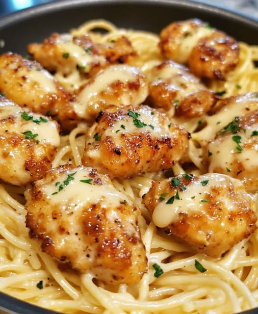 This Garlic Butter Chicken Bites with Creamy Parmesan Pasta is a flavor-packed, crowd-pleasing dinner that comes together quickly. Juicy, golden-brown chicken bites are coated in a garlic butter glaze and served over silky spaghetti tossed in a rich Parmesan cream sauce. Comforting, cheesy, and full of savory goodness.