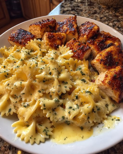 Garlic Butter Chicken Bowtie Pasta with Three Cheese Sauce