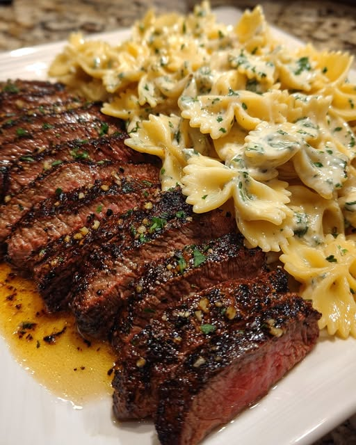 This Garlic Butter Flank Steak with Creamy Provolone Bowtie Pasta is a bold and comforting dish featuring juicy, perfectly seared steak paired with tender bowtie pasta in a rich, cheesy cream sauce. It’s a satisfying meal packed with savory garlic flavor and creamy goodness.
