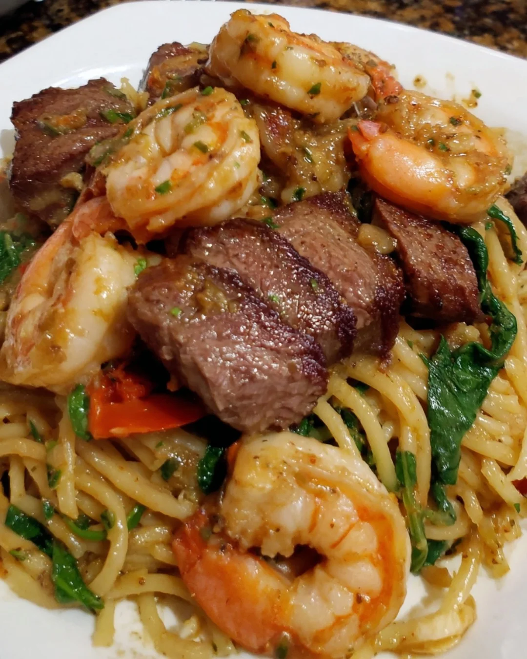 This Garlic Butter Pasta with Steak Bites, Shrimp and Spinach is a mouthwatering surf-and-turf dish loaded with bold flavor. Tender steak bites and juicy shrimp are tossed with spaghetti in a garlicky, buttery sauce and finished with fresh spinach and herbs for a rich, satisfying meal.