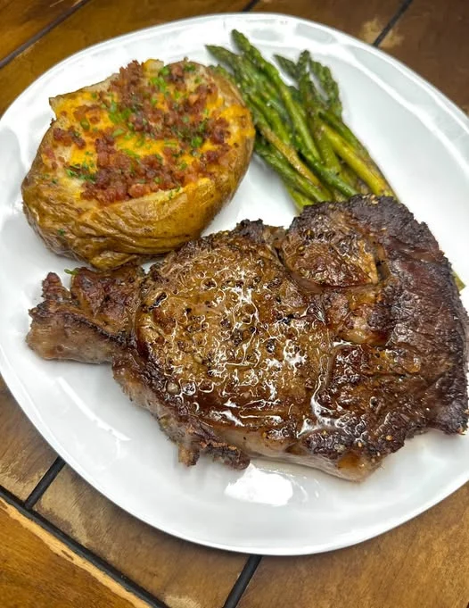 This classic steakhouse-style meal features a juicy garlic butter ribeye paired with a fully loaded baked potato and tender roasted asparagus. It’s simple, indulgent, and perfect for a satisfying dinner at home.