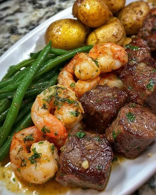 Garlic butter steak bites and shrimp make the perfect surf-and-turf dinner that feels both hearty and elegant. Tender seared steak cubes and juicy shrimp are coated in rich garlic butter and served alongside roasted baby potatoes and crisp green beans. This flavorful meal comes together quickly and delivers restaurant-quality taste right at home.