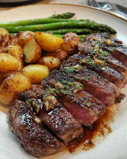 Garlic Butter Steak with Roasted Baby Potatoes and Asparagus is a restaurant-quality meal that is surprisingly easy to prepare at home. Juicy, perfectly seared steak is topped with rich garlic herb butter and served alongside crispy roasted baby potatoes and tender asparagus, creating a balanced and flavorful plate perfect for dinner.