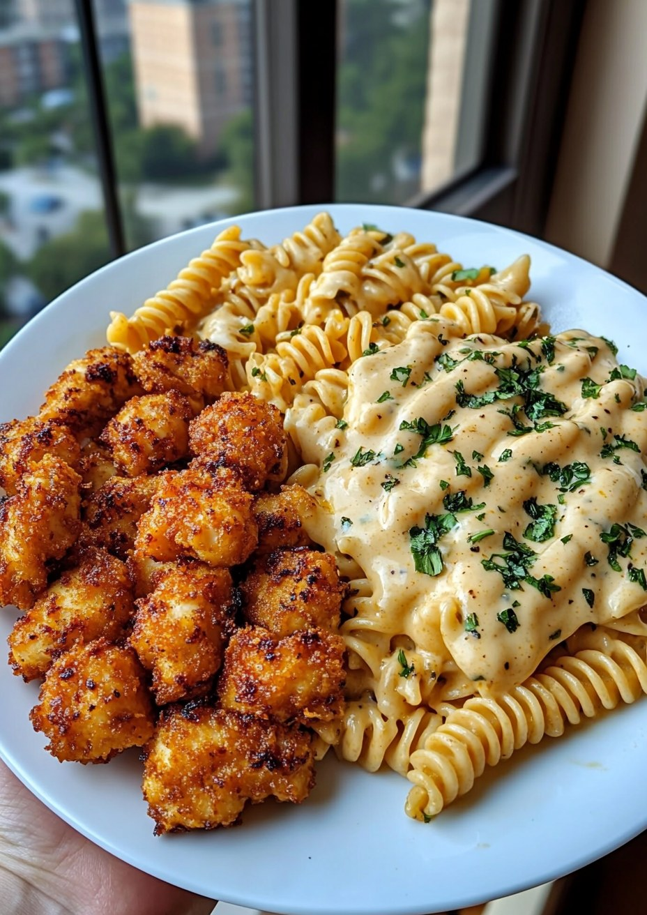 Garlic Parmesan Chicken Bites & Cajun Alfredo Pasta with Crispy Jalapeño Crunch